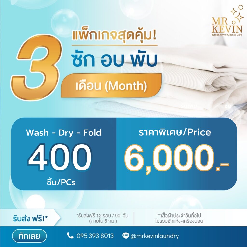 Mr Kevin มีโปรโมชั่นสำหรับซักผ้าหลายชิ้นสุดคุ้ม บริการรับซักรีดราคาสุดประหยัดมากมาย สามารถติดต่อสอบถามแพคเกจที่แนะนำและราคากับทางเราก่อนได้